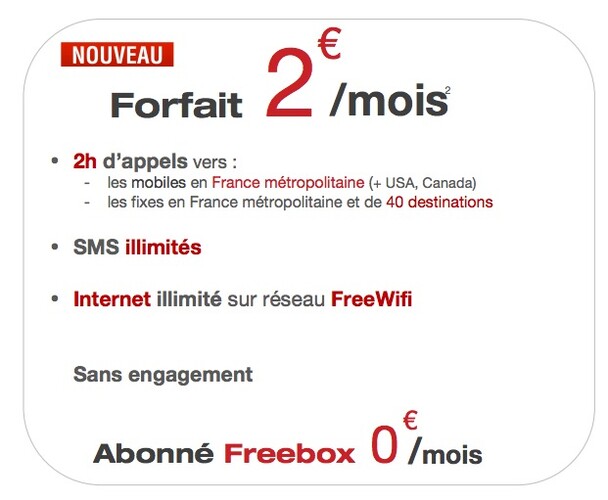 2 heures d'appel par mois, SMS illimités, internet illimité sur réseau FreeWifi... le tout pour 2 € par mois. Merci Free